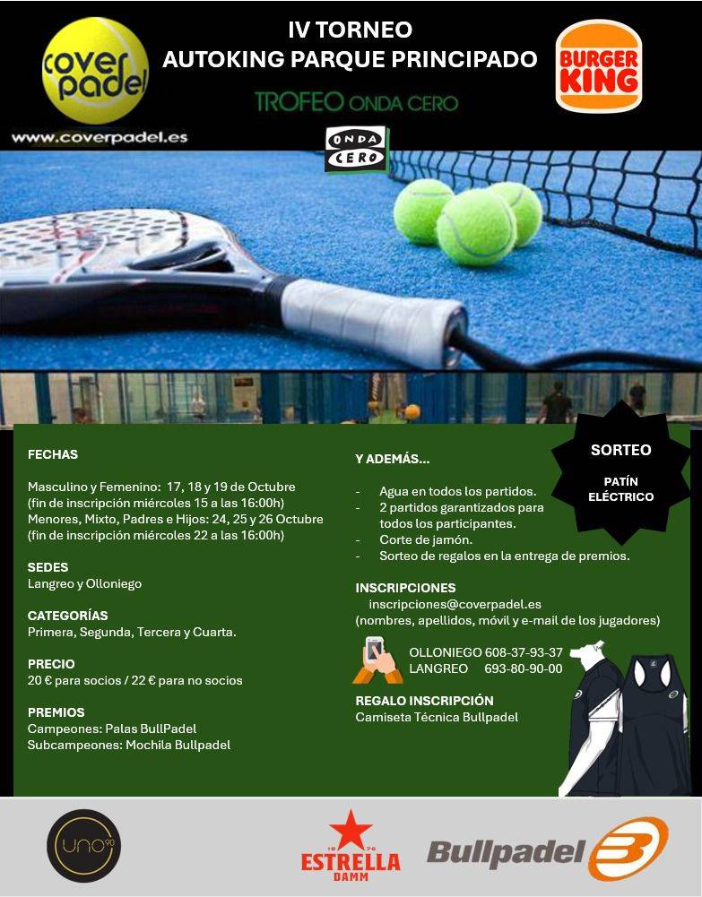 Hola a todos!!!! Ya tenéis disponibles los cuadros del Torneo AUTO KING PARQUE PRINCIPADO "Trofeo Onda Cero" para que podáis consultar vuestros enfrentamientos de este fin de semana en las instalaciones de Cover Padel